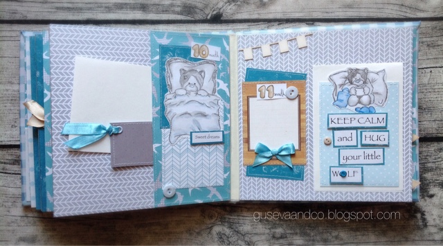 The album of first year for baby boy Arlan. The size of this album is 20x20 santimeters. Grey, blue, turquoise are the colours of this project. The little cute wolf is a main character of this baby book. I inspired of this from Tatty Teddy. 50 photos and a lot of cards for notes about important things and baby boy achievements are in this album. Design paper, buttons, ribbons, chipboards and other things are decorated this new album for baby boy Arlan. Happy viewing!